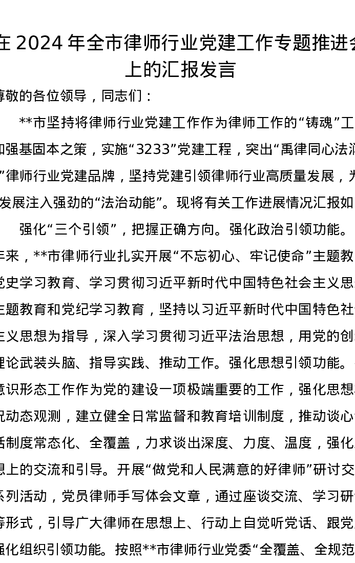 在2024年全市律师行业党建工作专题推进会上的汇报发言