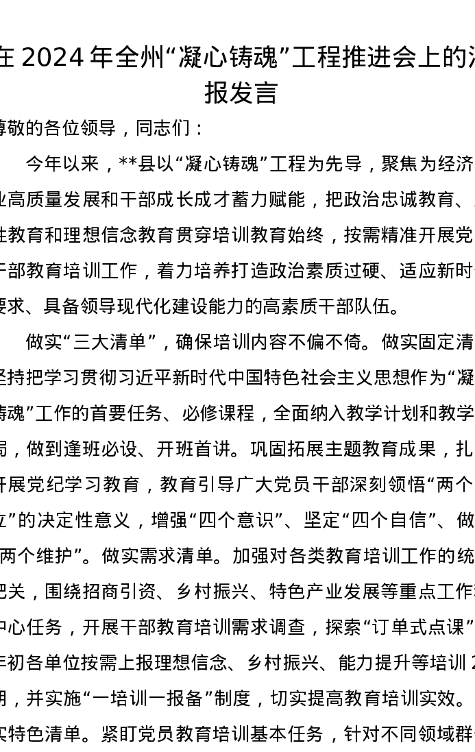 在2024年全州“凝心铸魂”工程推进会上的汇报发言