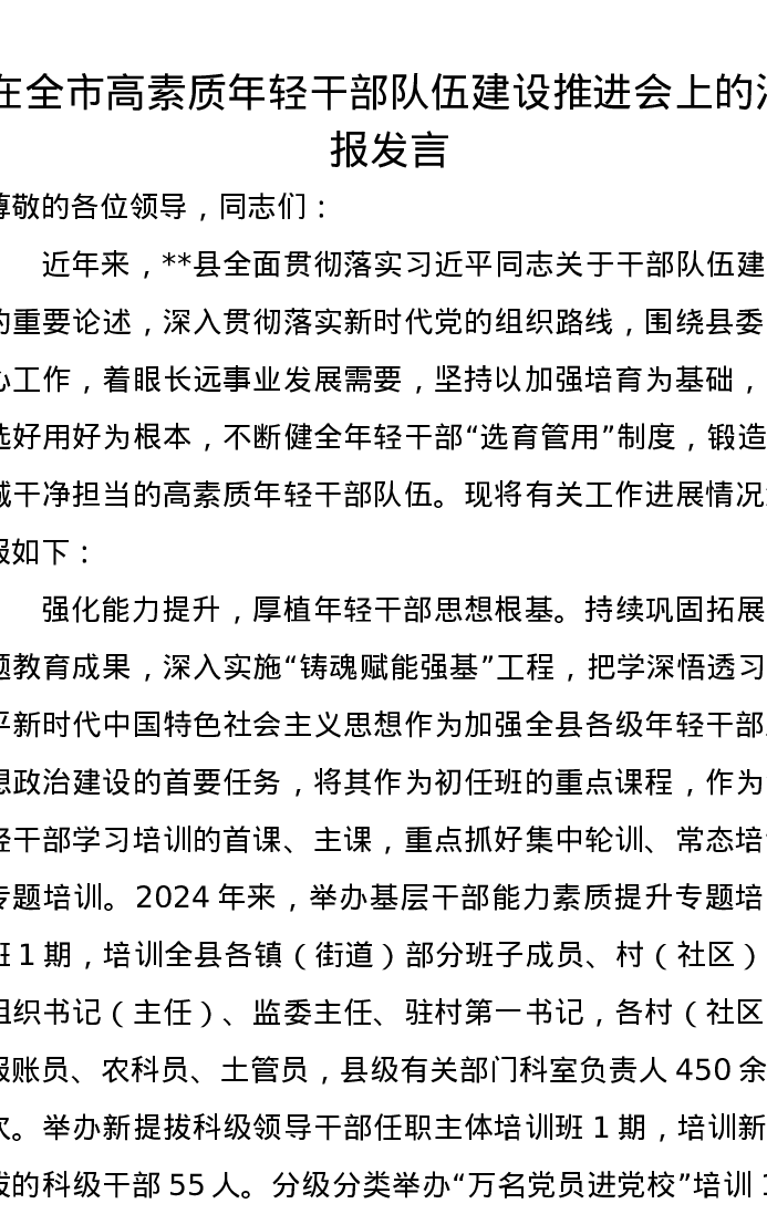 在全市高素质年轻干部队伍建设推进会上的汇报发言