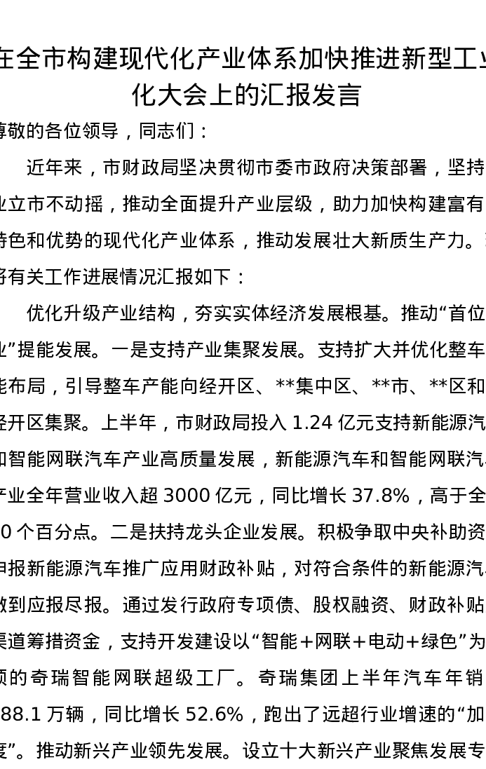 在全市构建现代化产业体系加快推进新型工业化大会上的汇报发言