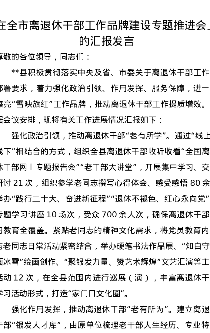 在全市离退休干部工作品牌建设专题推进会上的汇报发言
