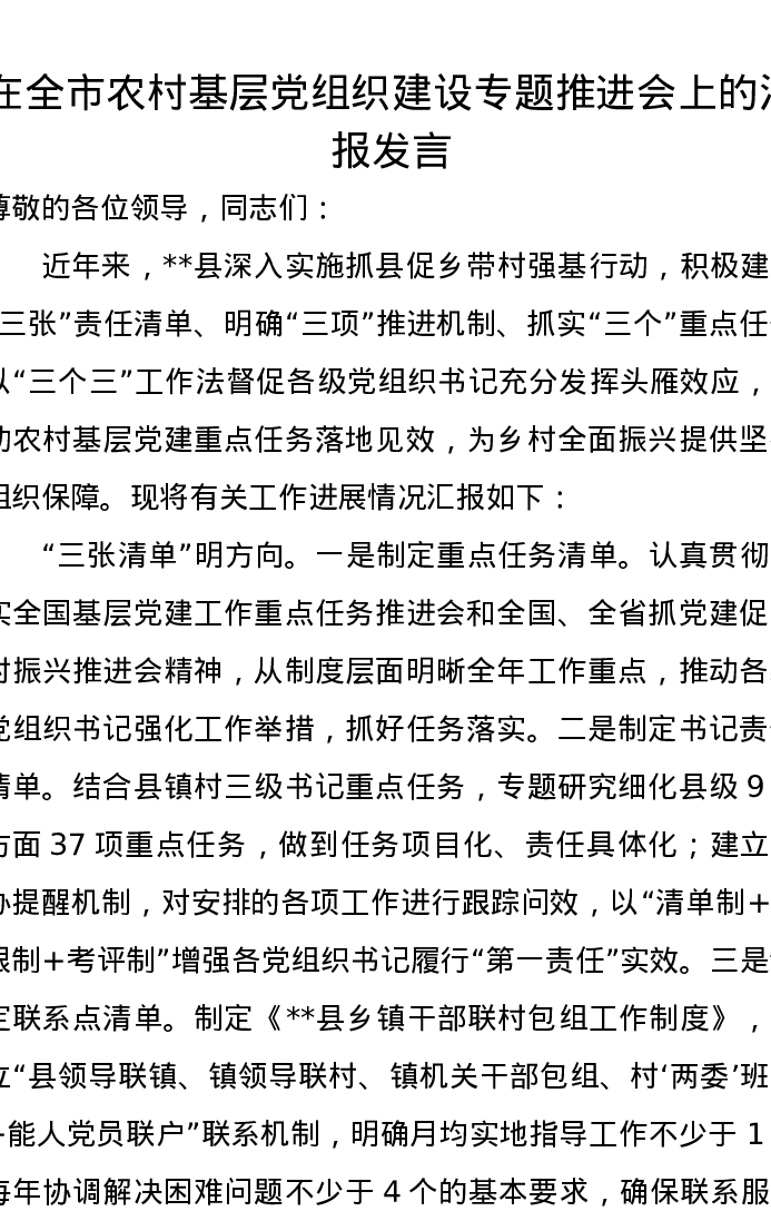 在全市农村基层党组织建设专题推进会上的汇报发言