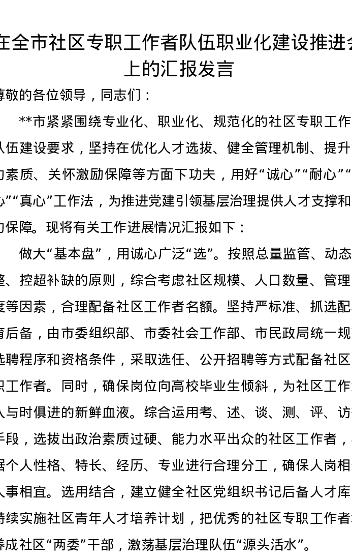 在全市社区专职工作者队伍职业化建设推进会上的汇报发言