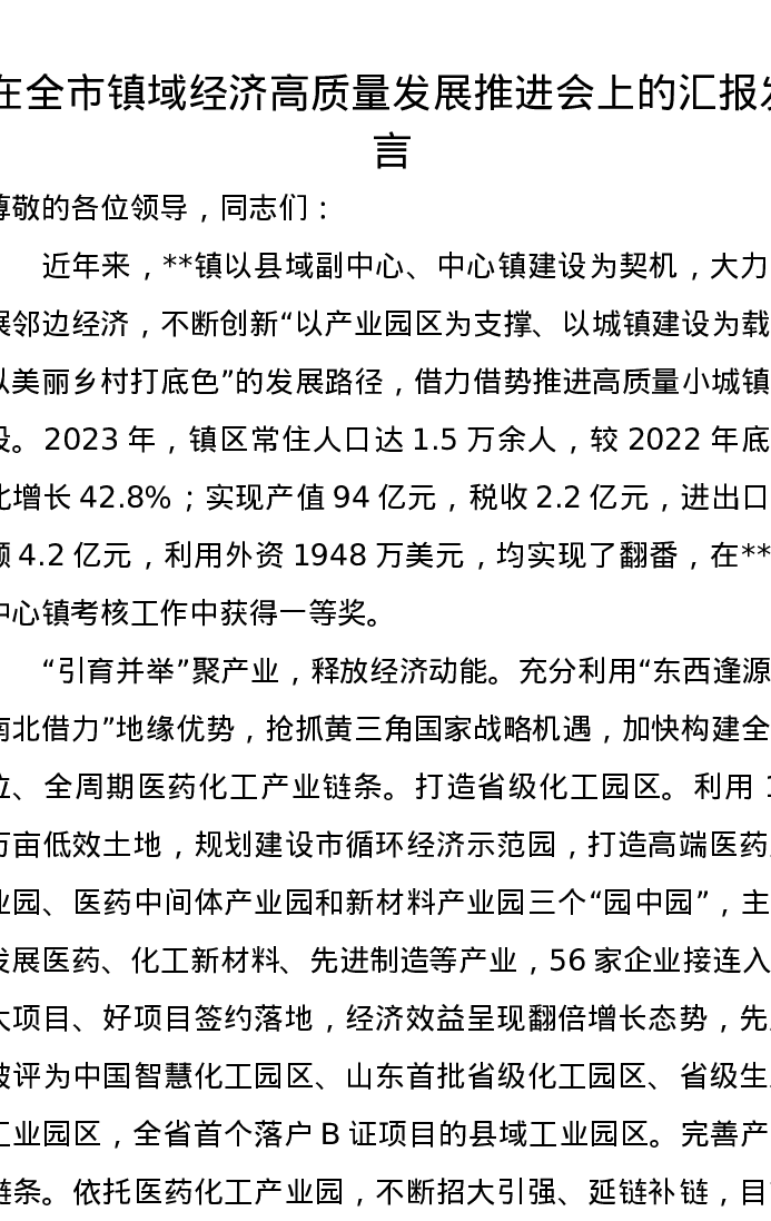 在全市镇域经济高质量发展推进会上的汇报发言