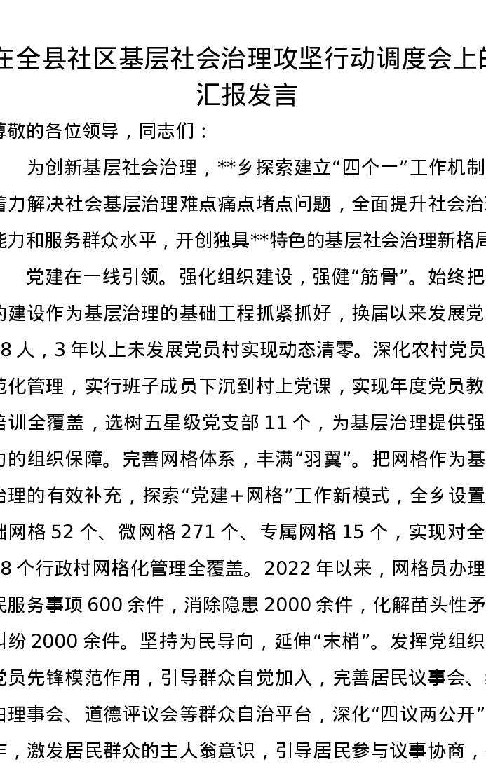 在全县社区基层社会治理攻坚行动调度会上的汇报发言