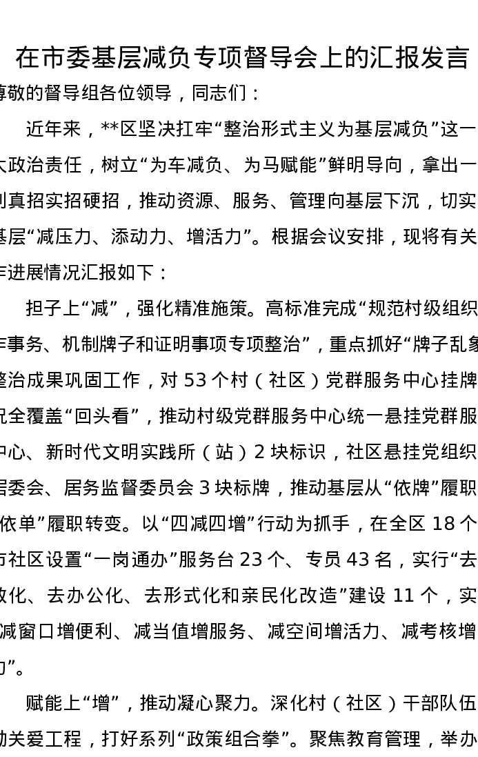 在市委基层减负专项督导会上的汇报发言