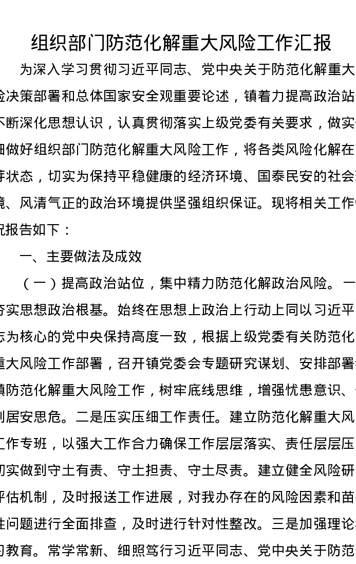 组织部门防范化解重大风险工作汇报