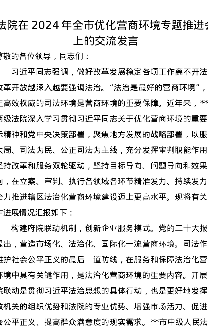 法院在2024年全市优化营商环境专题推进会上的交流发言