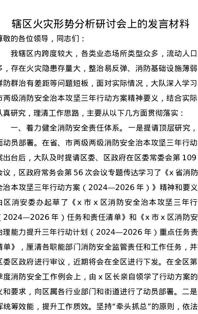 辖区火灾形势分析研讨会上的发言材料