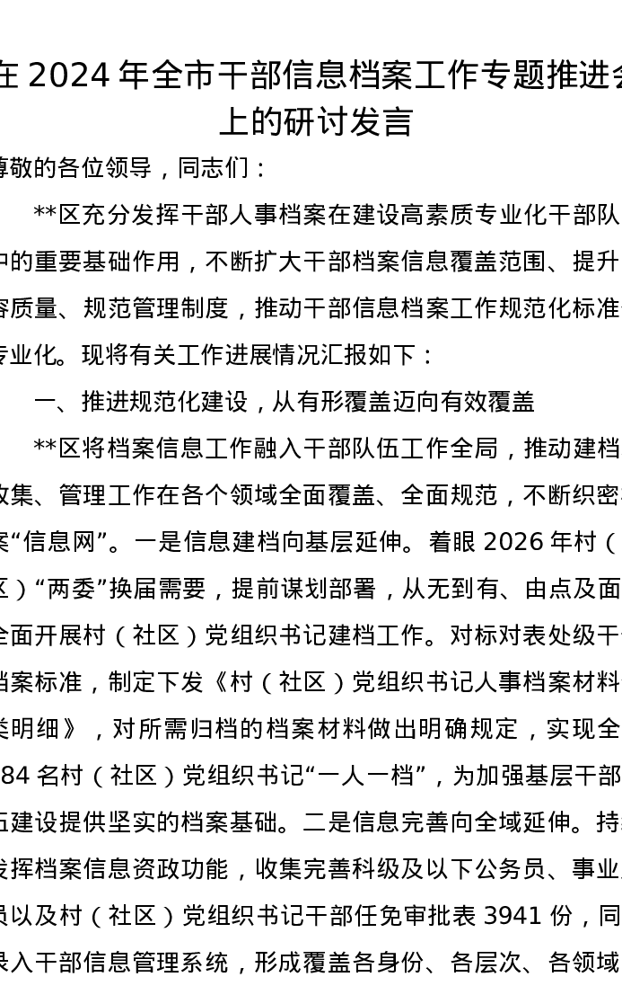 在2024年全市干部信息档案工作专题推进会上的研讨发言