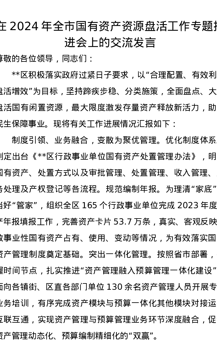 在2024年全市国有资产资源盘活工作专题推进会上的交流发言