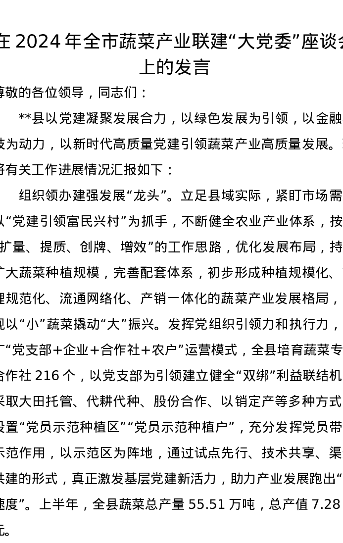 在2024年全市蔬菜产业联建“大党委”座谈会上的发言