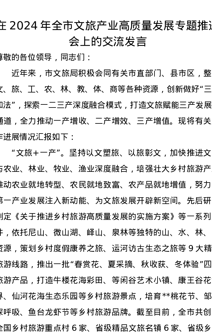 在2024年全市文旅产业高质量发展专题推进会上的交流发言