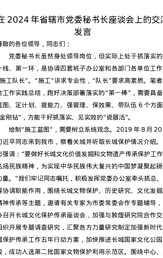 在2024年省辖市党委秘书长座谈会上的交流发言