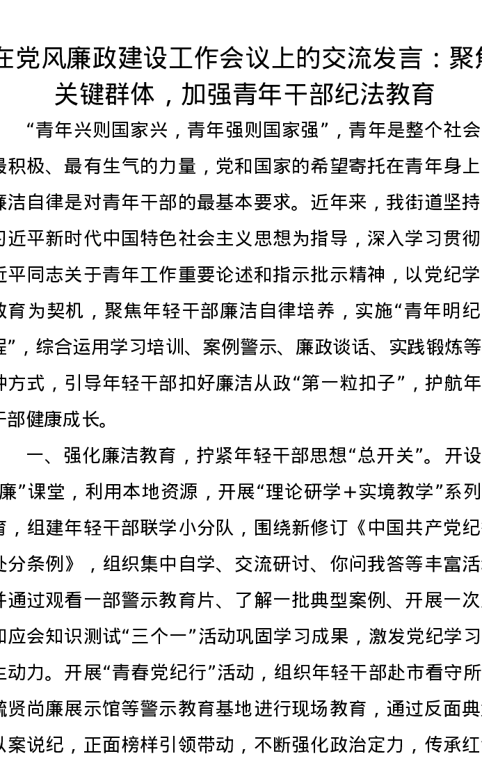 在党风廉政建设工作会议上的交流发言:聚焦关键群体,加强青年干部纪法教育