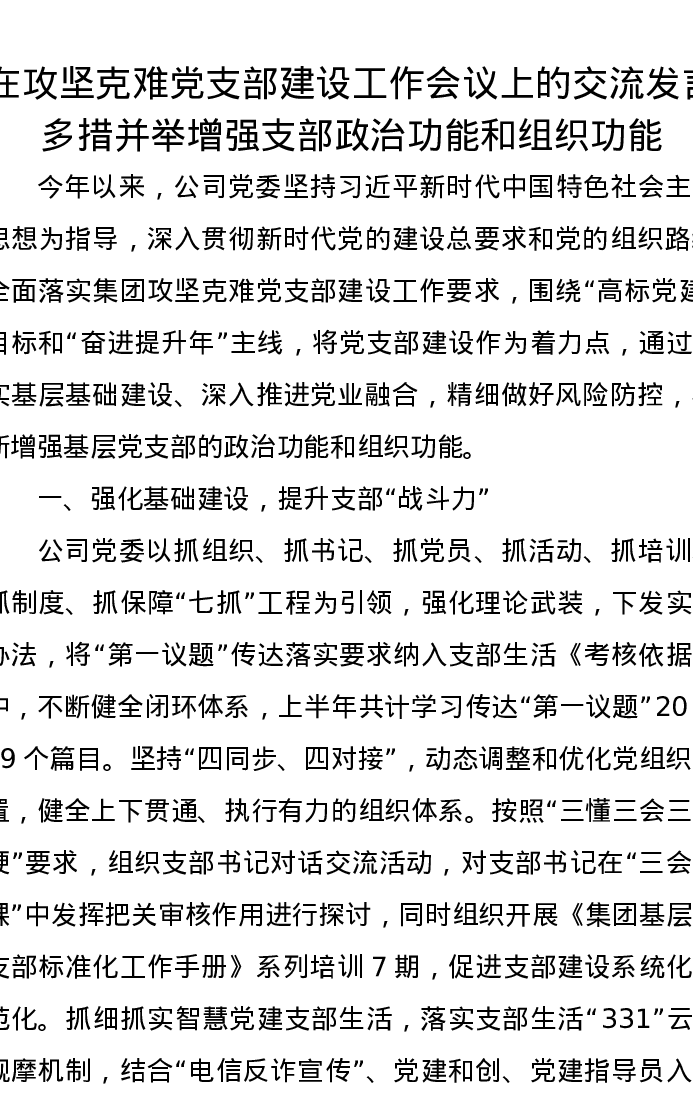 在攻坚克难党支部建设工作会议上的交流发言:多措并举增强支部政治功能和组织功能
