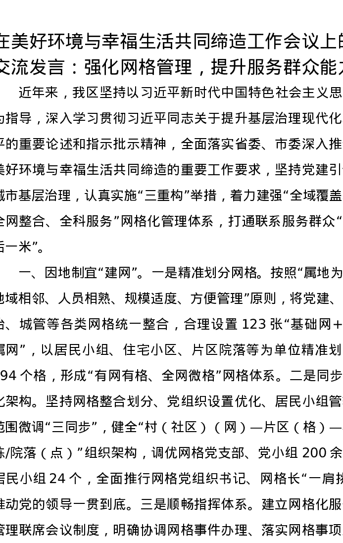 在美好环境与幸福生活共同缔造工作会议上的交流发言:强化网格管理,提升服务群众能力