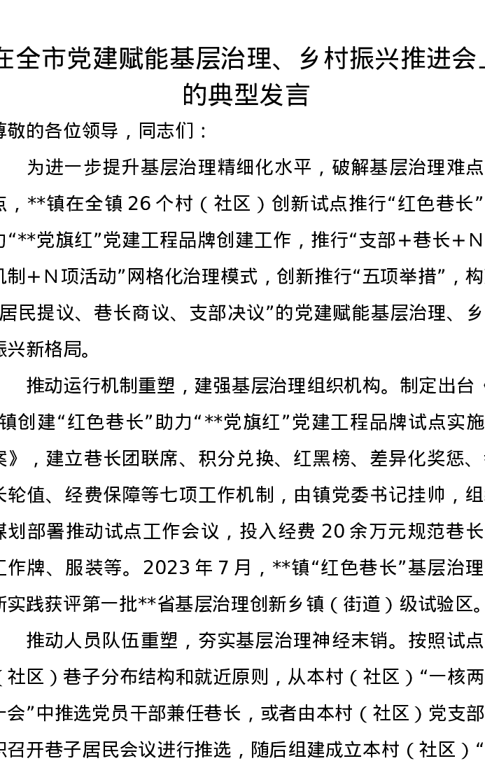 在全市党建赋能基层治理、乡村振兴推进会上的典型发言