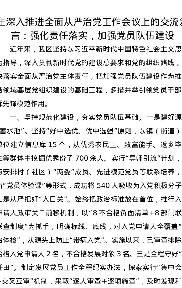 在深入推进全面从严治党工作会议上的交流发言:强化责任落实,加强党员队伍建设