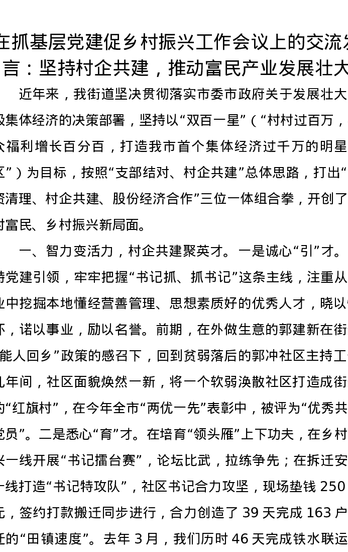 在抓基层党建促乡村振兴工作会议上的交流发言:坚持村企共建,推动富民产业发展壮大