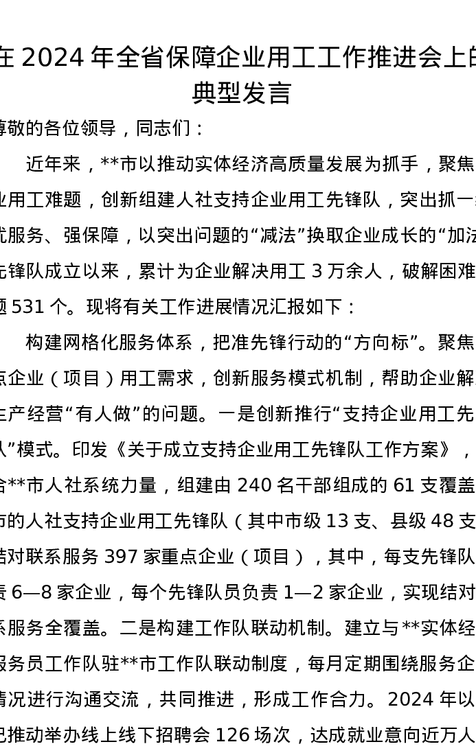 在2024年全省保障企业用工工作推进会上的典型发言