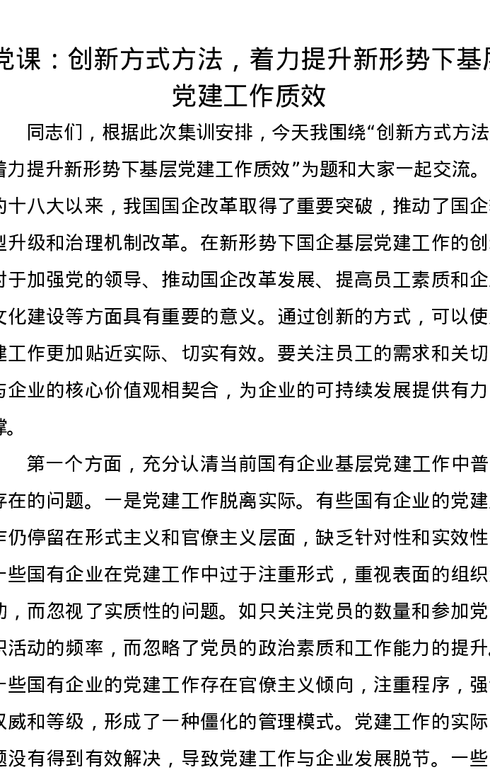 党课讲稿:创新方式方法,着力提升新形势下基层党建工作质效