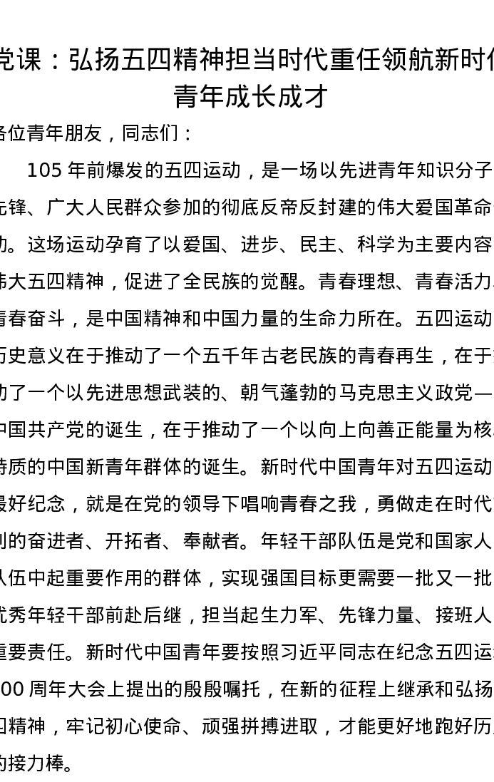 党课讲稿:弘扬五四精神担当时代重任领航新时代青年成长成才