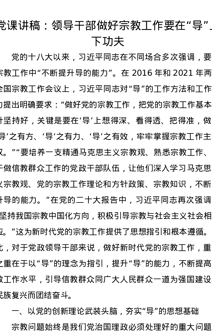 党课讲稿:领导干部做好宗教工作要在“导”上下功夫