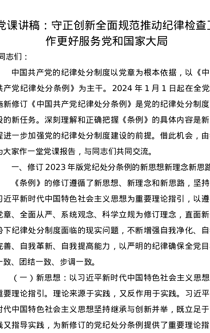 党课讲稿:守正创新全面规范推动纪律检查工作更好服务党和国家大局