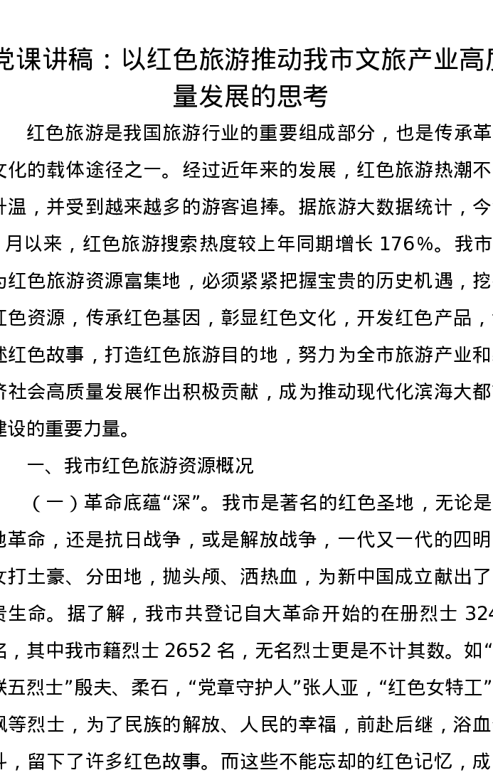 党课讲稿:以红色旅游推动我市文旅产业高质量发展的思考