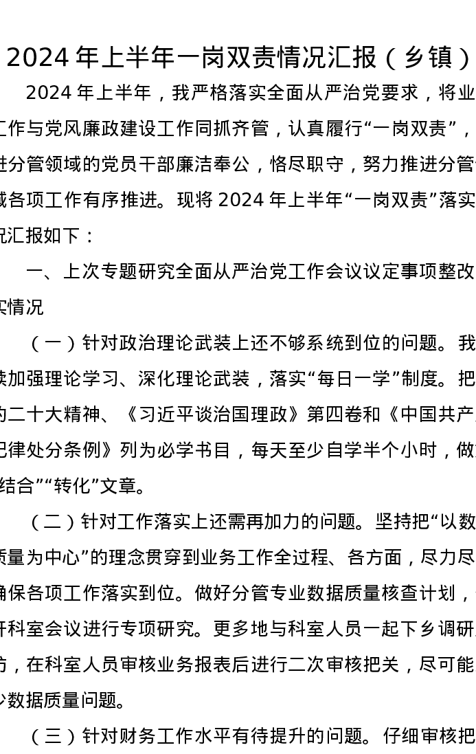 2024年上半年一岗双责情况汇报(乡镇)
