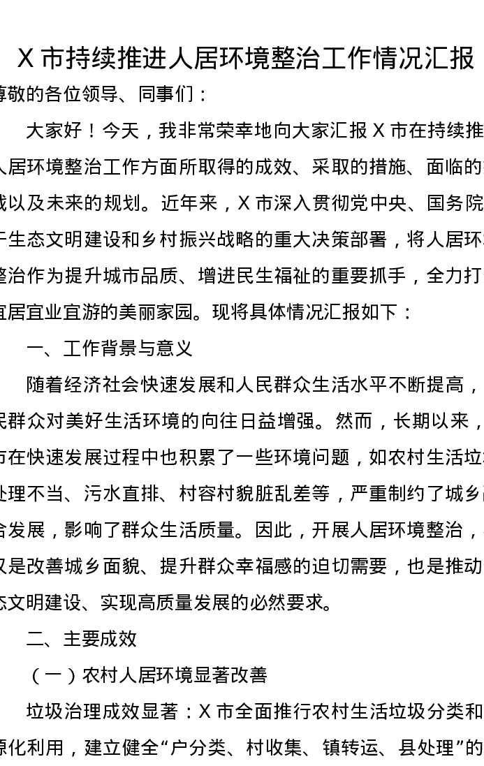 X市持续推进人居环境整治工作情况汇报