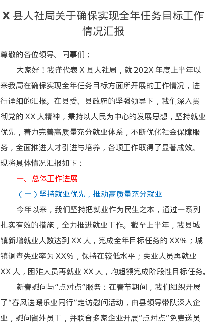X县人社局关于确保实现全年任务目标工作情况汇报