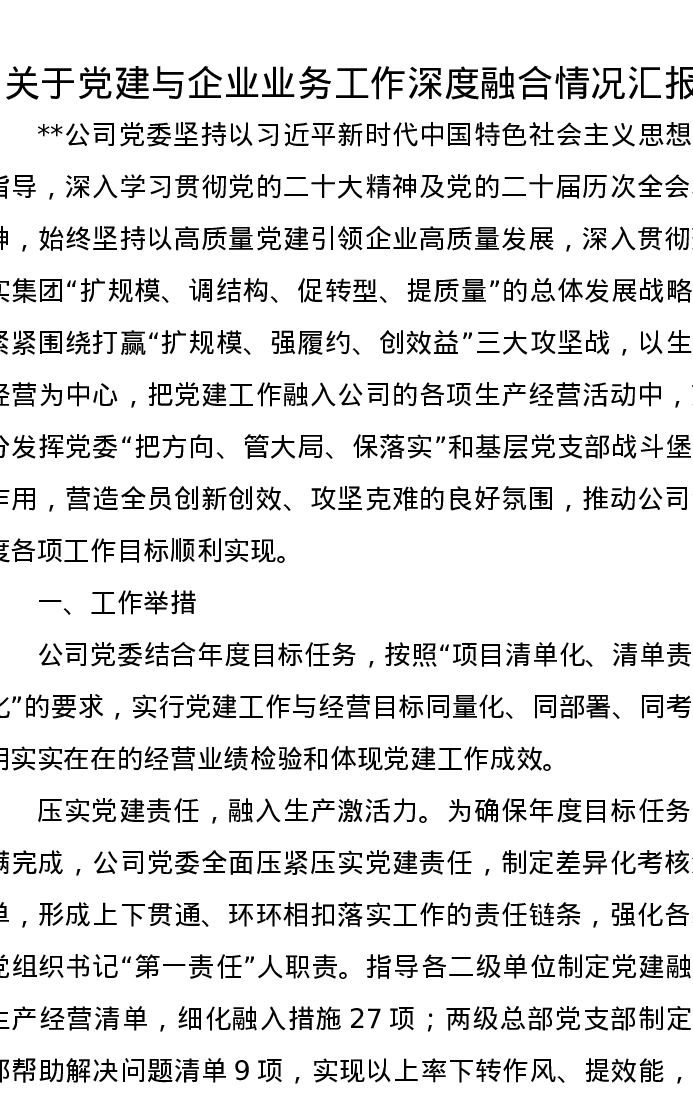 关于党建与企业业务工作深度融合情况汇报
