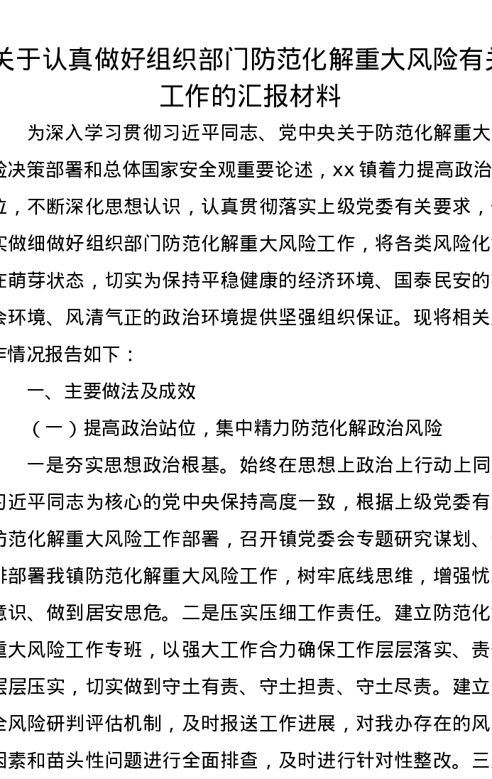 关于认真做好组织部门防范化解重大风险有关工作的汇报材料
