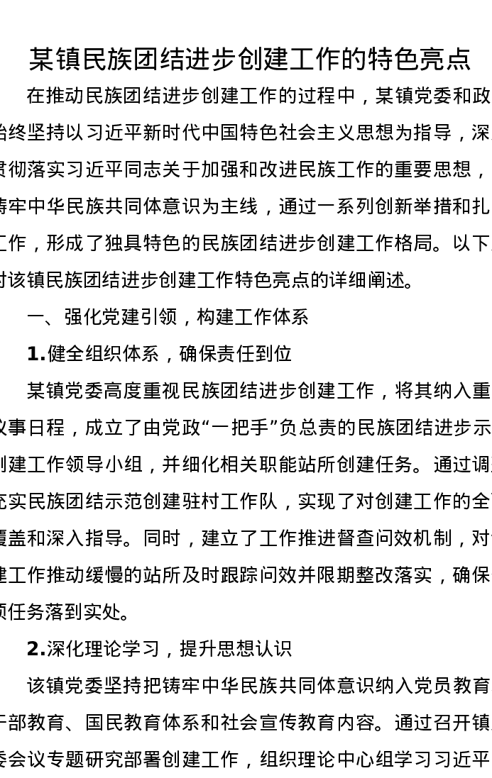 汇报:某镇民族团结进步创建工作的特色亮点