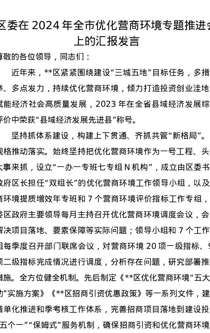 区委在2024年全市优化营商环境专题推进会上的汇报发言