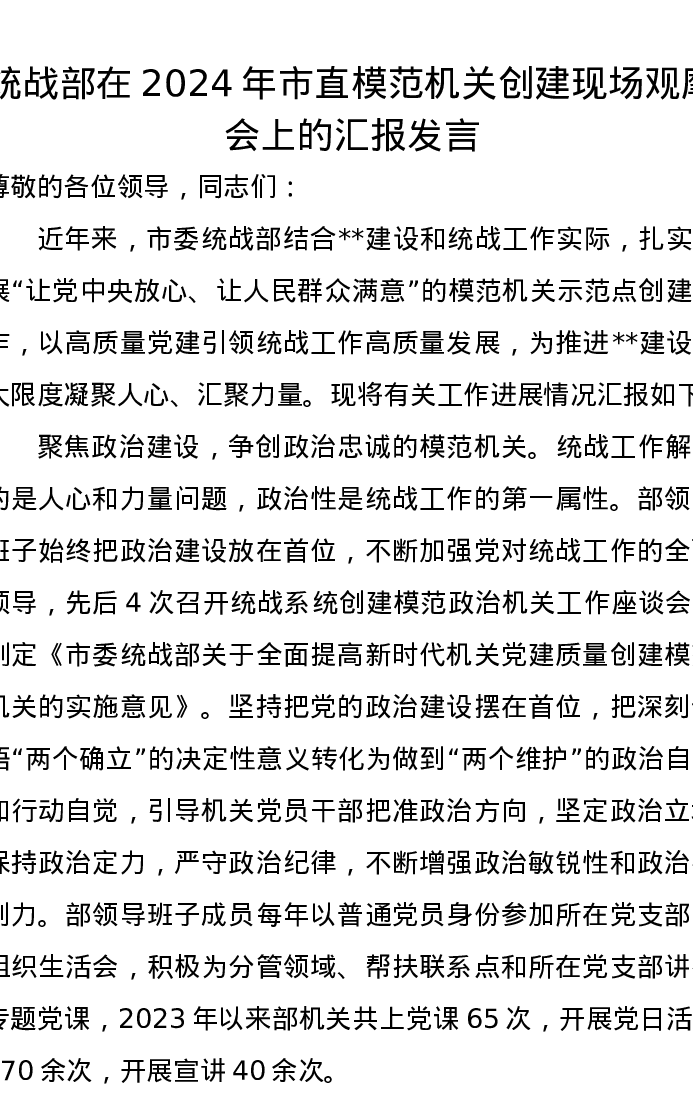 统战部在2024年市直模范机关创建现场观摩会上的汇报发言