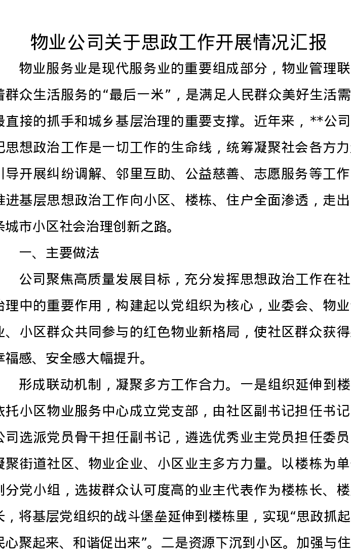 物业公司关于思政工作开展情况汇报