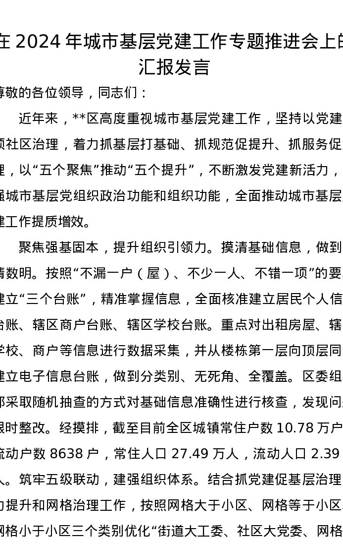 在2024年城市基层党建工作专题推进会上的汇报发言