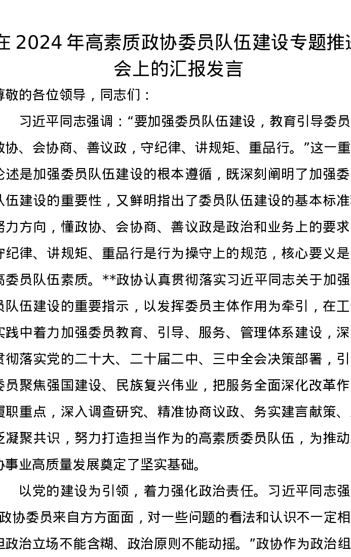 在2024年高素质政协委员队伍建设专题推进会上的汇报发言