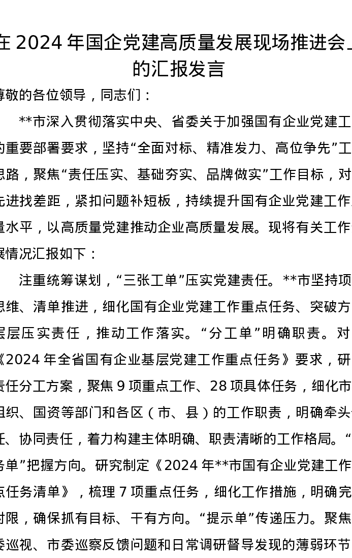 在2024年国企党建高质量发展现场推进会上的汇报发言