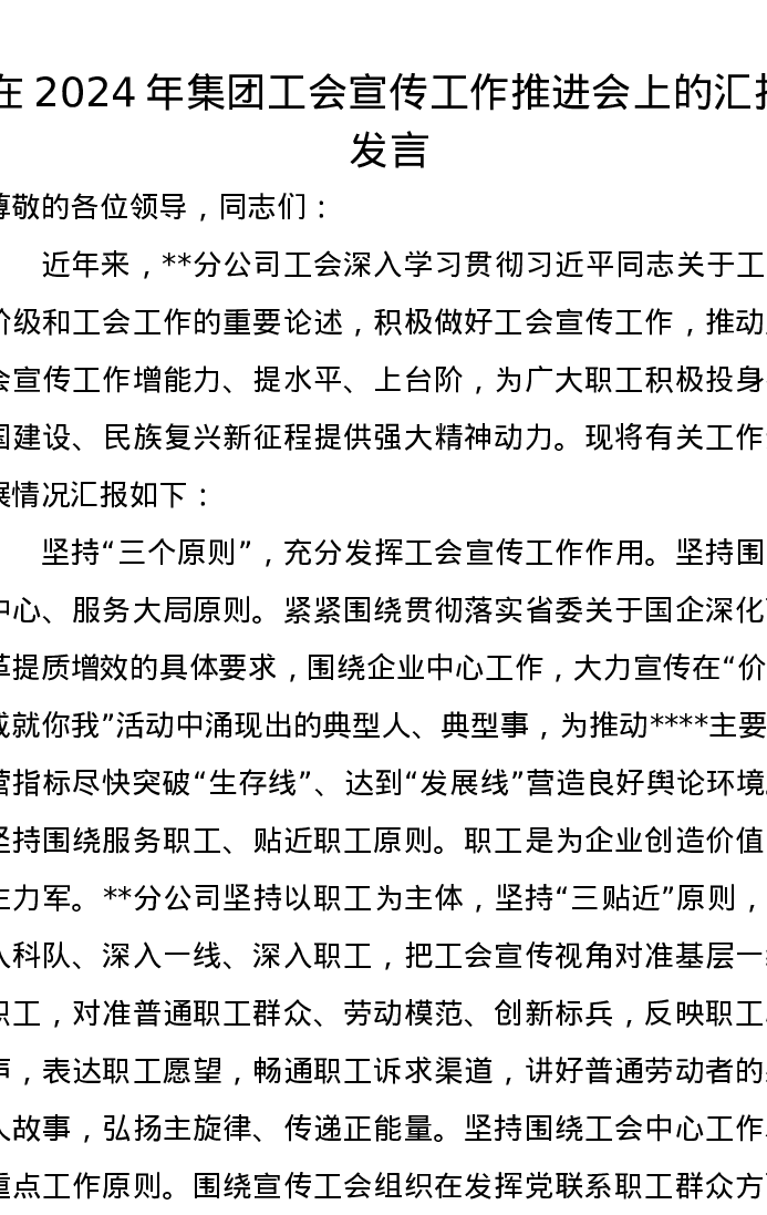 在2024年集团工会宣传工作推进会上的汇报发言