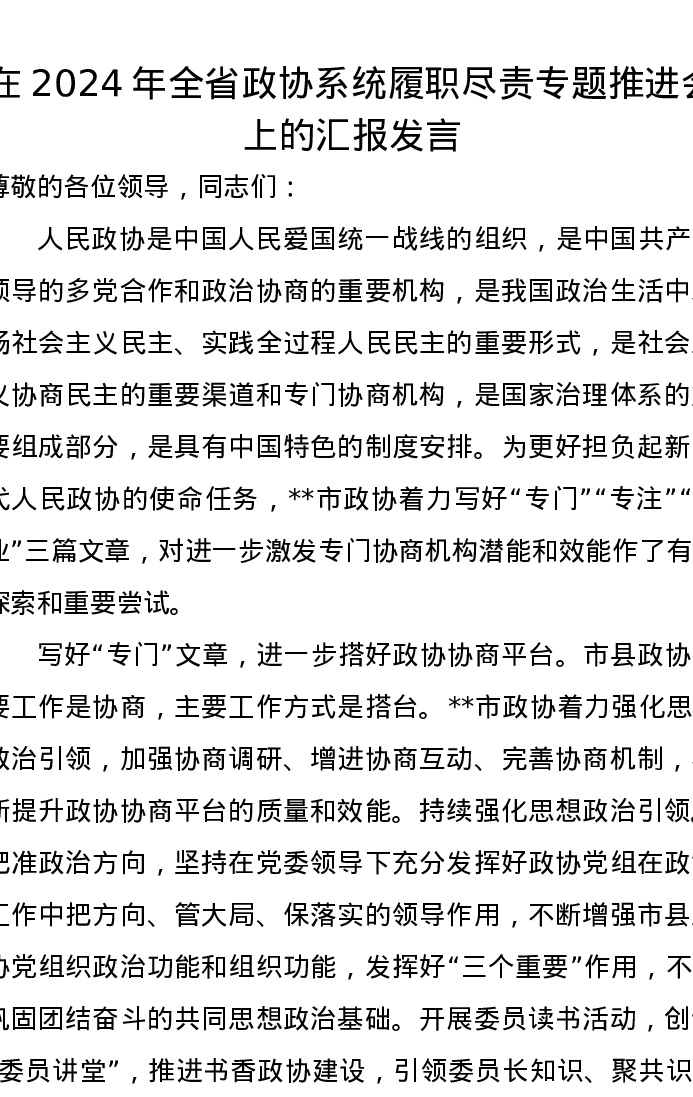 在2024年全省政协系统履职尽责专题推进会上的汇报发言