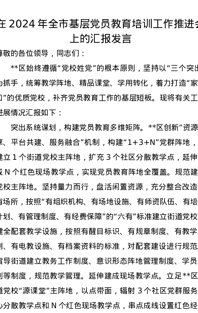 在2024年全市基层党员教育培训工作推进会上的汇报发言