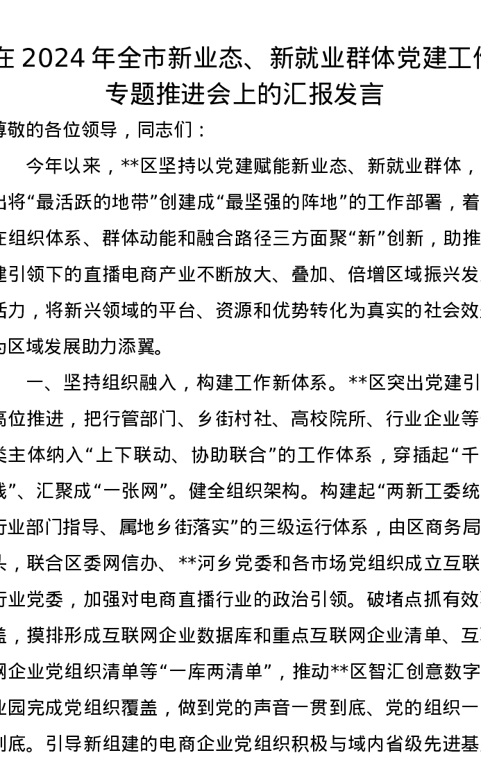 在2024年全市新业态、新就业群体党建工作专题推进会上的汇报发言