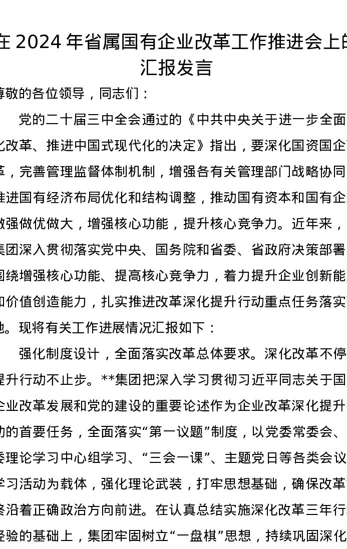 在2024年省属国有企业改革工作推进会上的汇报发言