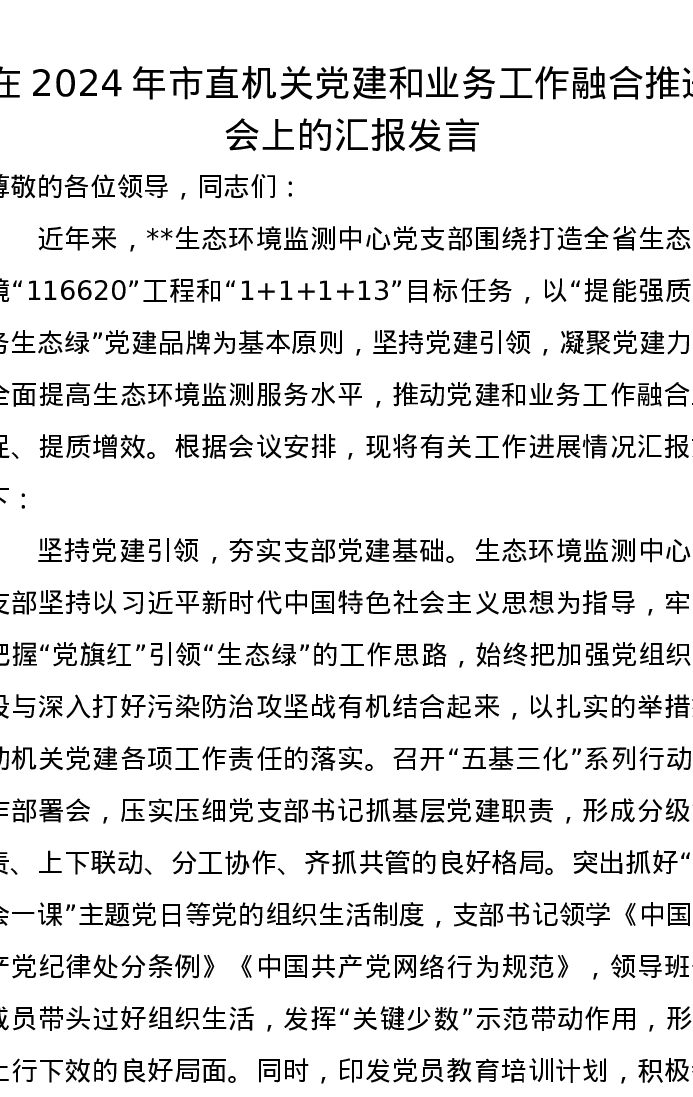 在2024年市直机关党建和业务工作融合推进会上的汇报发言
