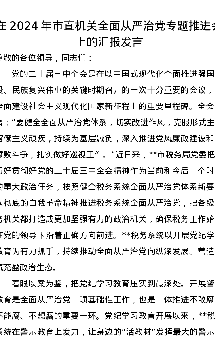 在2024年市直机关全面从严治党专题推进会上的汇报发言