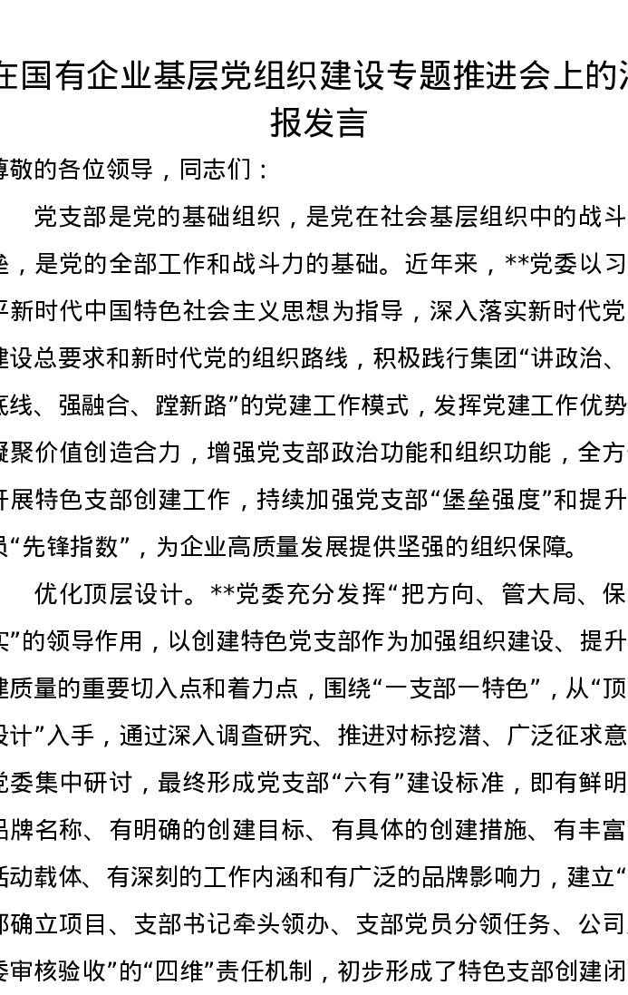 在国有企业基层党组织建设专题推进会上的汇报发言
